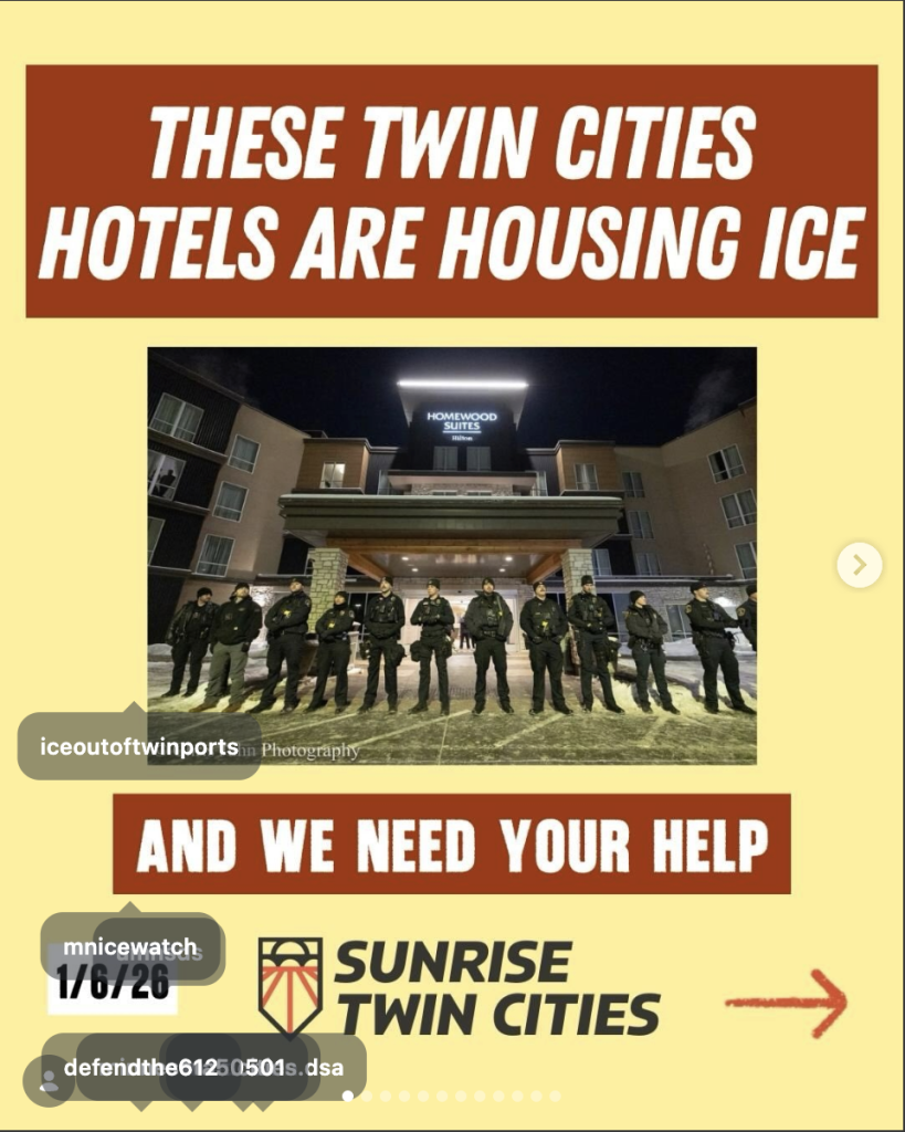 At the center of the unrest is the Sunrise Movement, a left-wing group founded to fight climate change that has since directed its local chapters to fight the Trump administration. For Sunrise Twin Cities, that means tormenting ICE agents on the ground. The group holds in-person "action trainings" on how to "stop ICE & build a revolution." It also maintains a running list of the Twin Cities hotels housing ICE agents and organizes late-night "noise demonstrations" aimed at making it "impossible" for those hotels to operate.