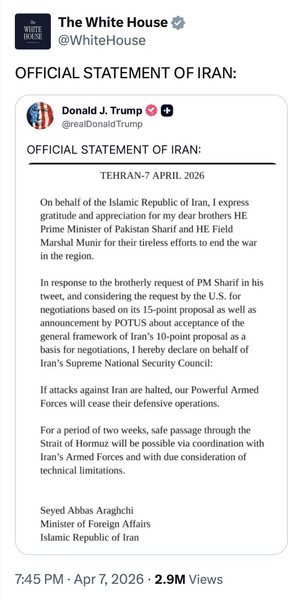 Statement by President Trump on Tuesday, April 7, 2026, 6:30 PM: