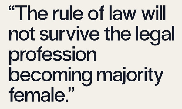 The field that frightens me most is the law. All of us depend on a functioning legal system, and, to be blunt, the rule of law will not survive the legal profession becoming majority female. The rule of law is not just about writing rules down. It means following them even when they yield an outcome that tugs at your heartstrings or runs contrary to your gut sense of which party is more sympathetic.