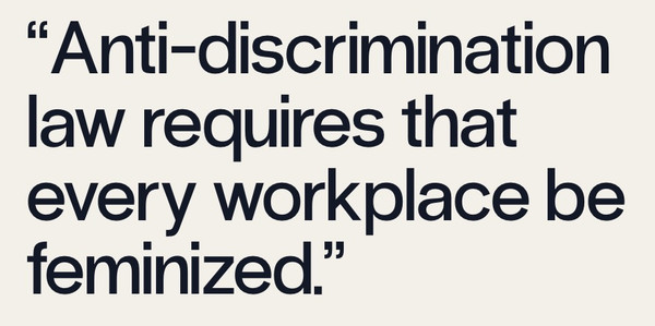 Anti-discrimination law requires that every workplace be feminized. A landmark case in 1991 found that pinup posters on the walls of a shipyard constituted a hostile environment for women, and that principle has grown to encompass many forms of masculine conduct. Dozens of Silicon Valley companies have been hit with lawsuits alleging “frat boy culture” or “toxic bro culture,” and a law firm specializing in these suits brags of settlements ranging from $450,000 to $8 million.